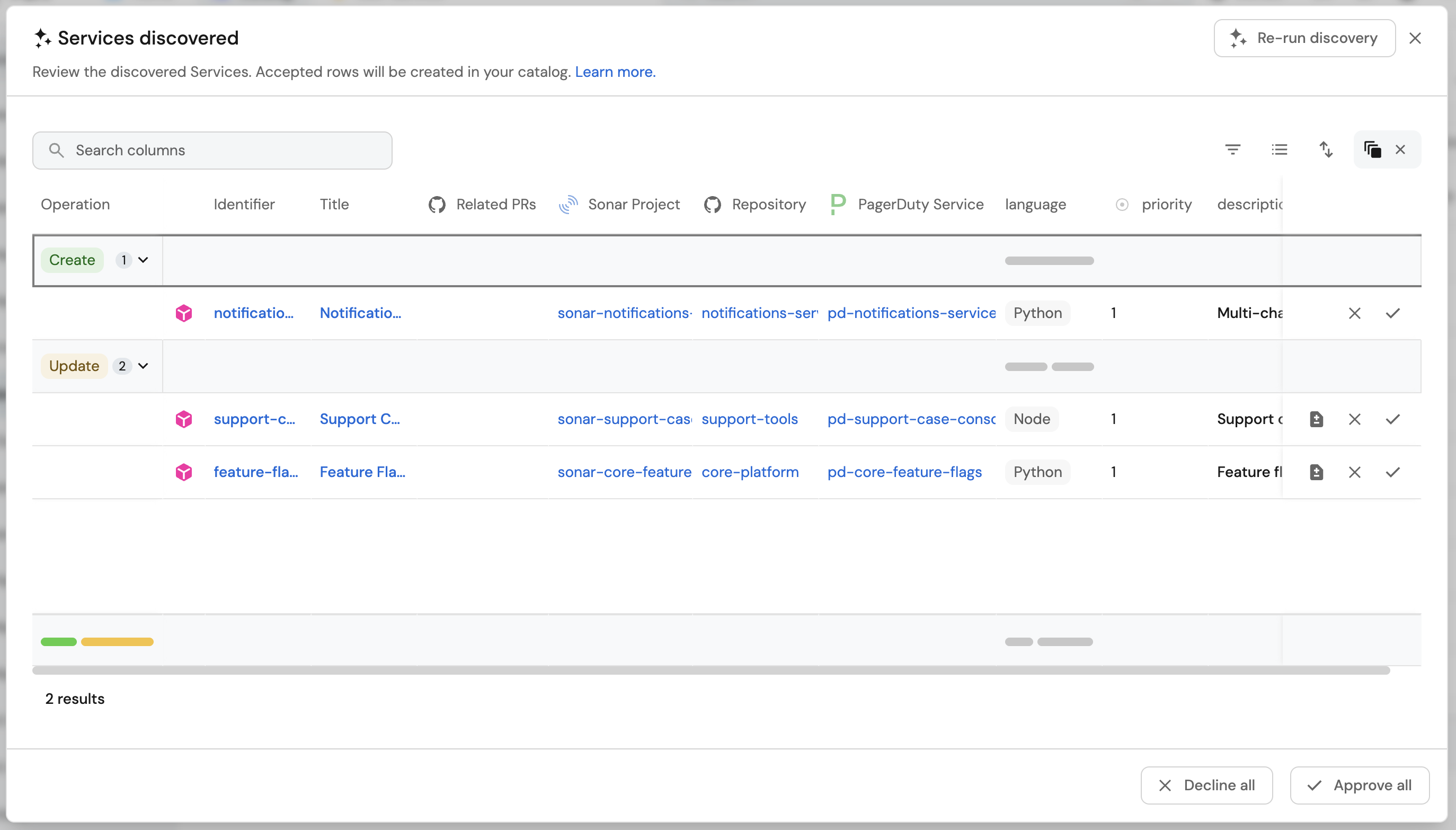 - Services: A service can be identified through various sources such as Jira projects, Snyk projects, PagerDuty services, Sonar projects, or a combination of these. Since no single integration fully represents the service, catalog discovery can analyze these related entities to suggest services.