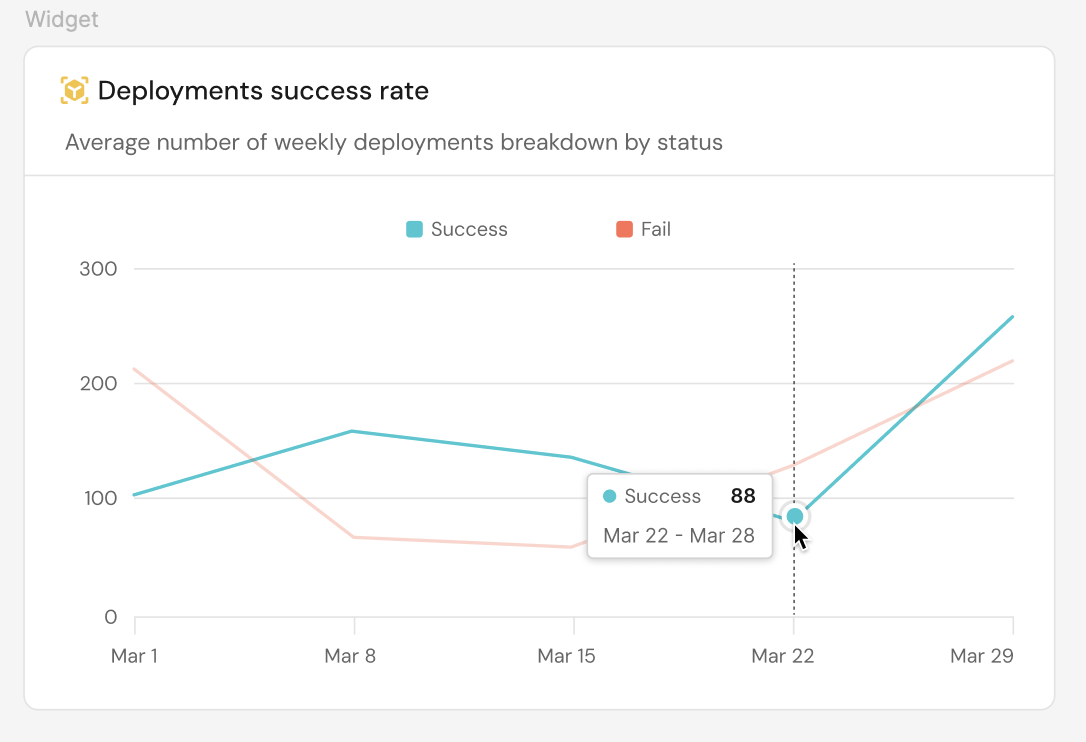 For example, here is a line chart displaying the average deployment rate over the span of a month, in weekly intervals, broken down by the status property (Success and Fail).