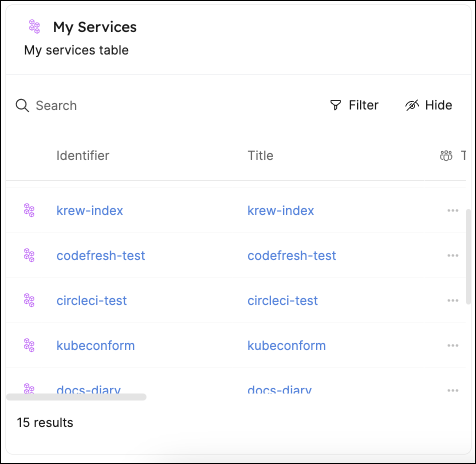 Click a slice to open a temporary entity view listing the entities included in that slice. For example, in a chart showing programming languages used by services, clicking the JavaScript slice shows all services where the language is JavaScript.