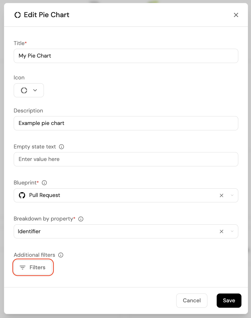Pie charts, number charts and tables support filters, which allow you to include or exclude specific data from them. The filters are based on Port's Search Rules, and are set when creating the widget:
