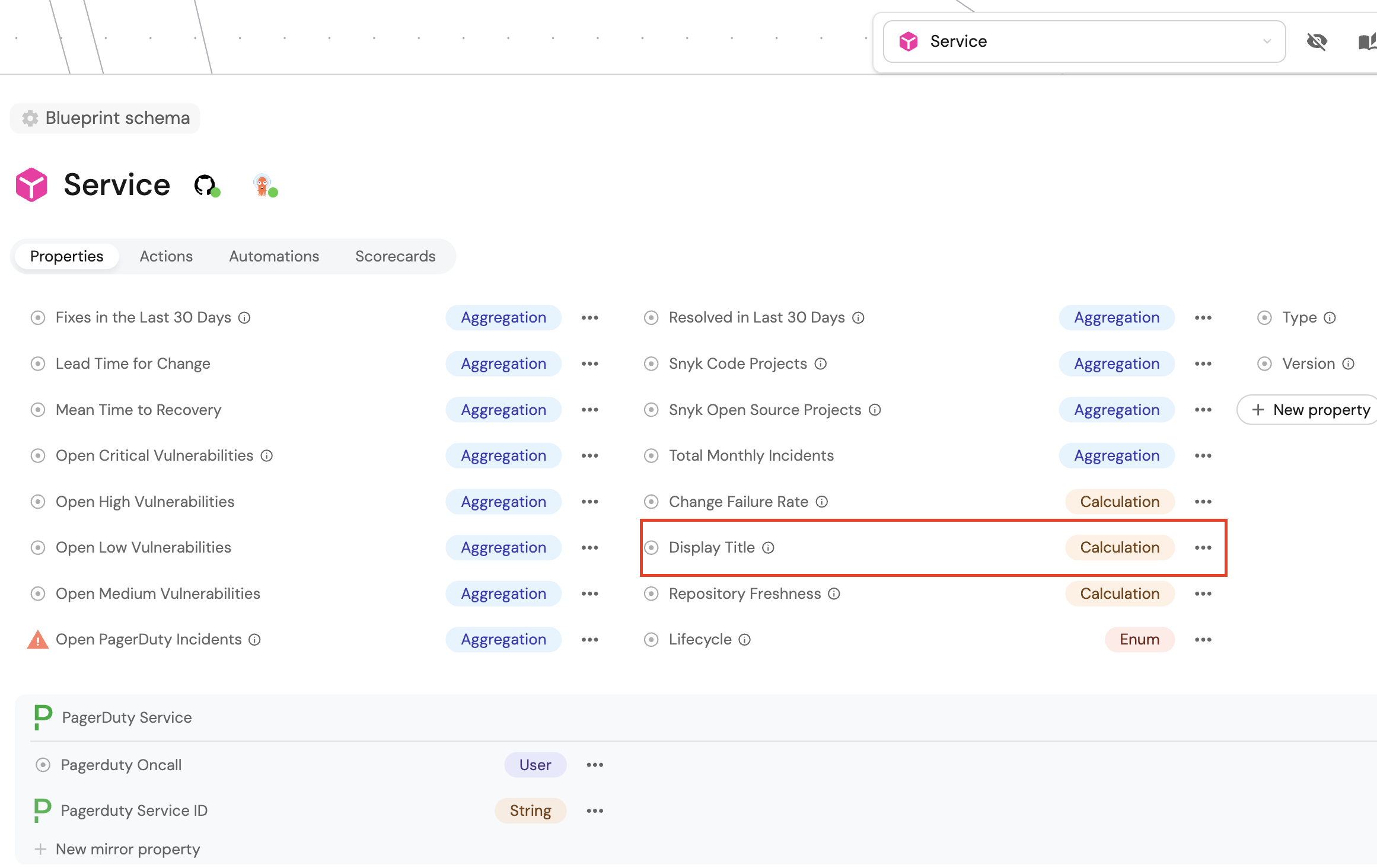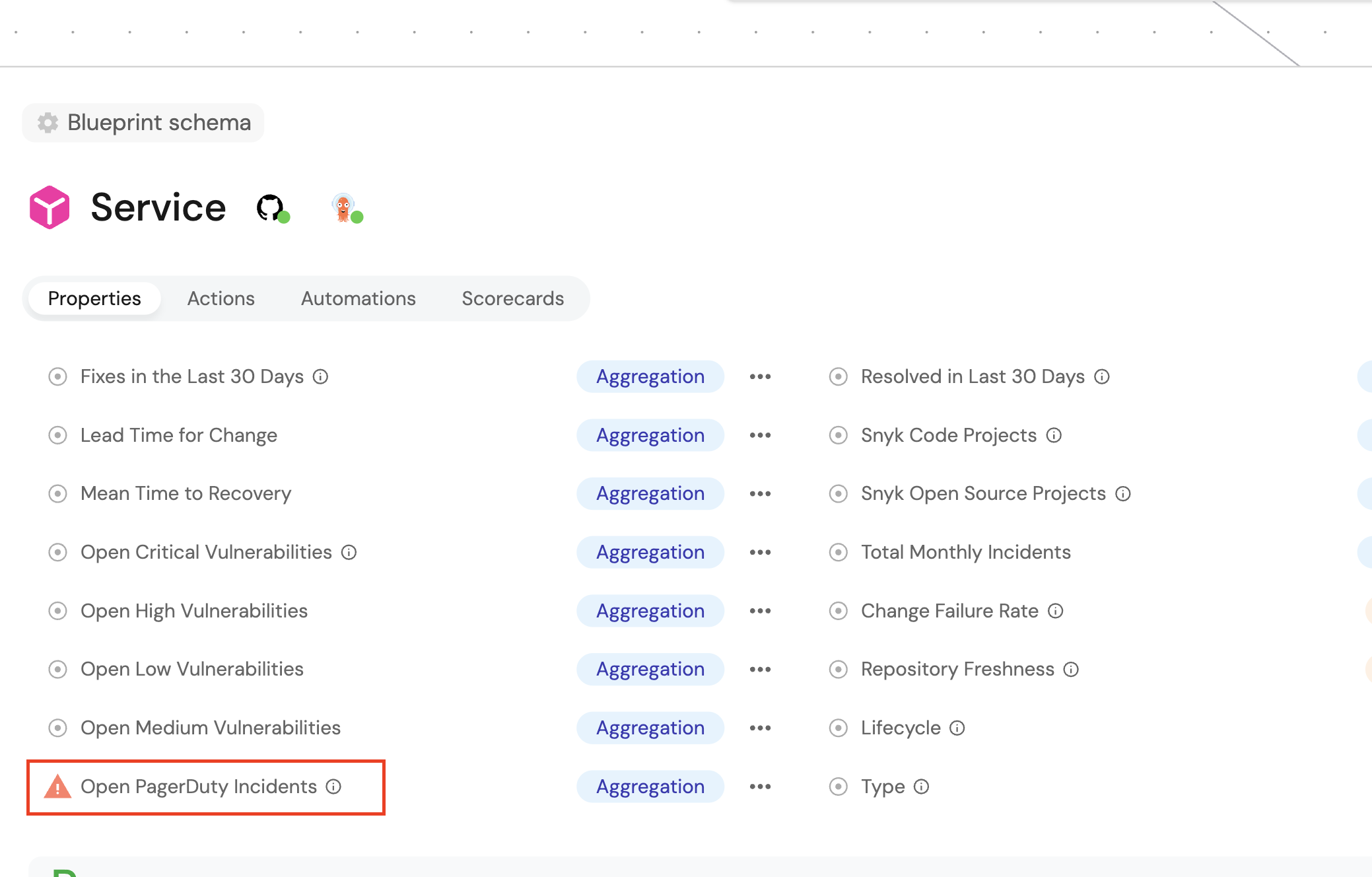 "Add an aggregation property to the service blueprint that counts the number of open incidents from PagerDuty"