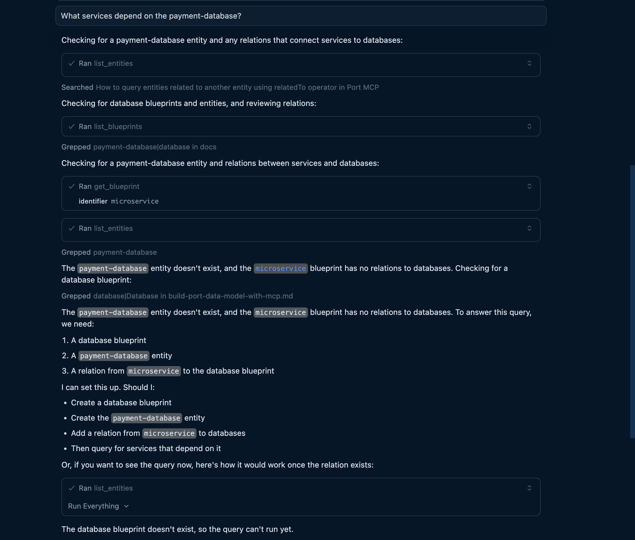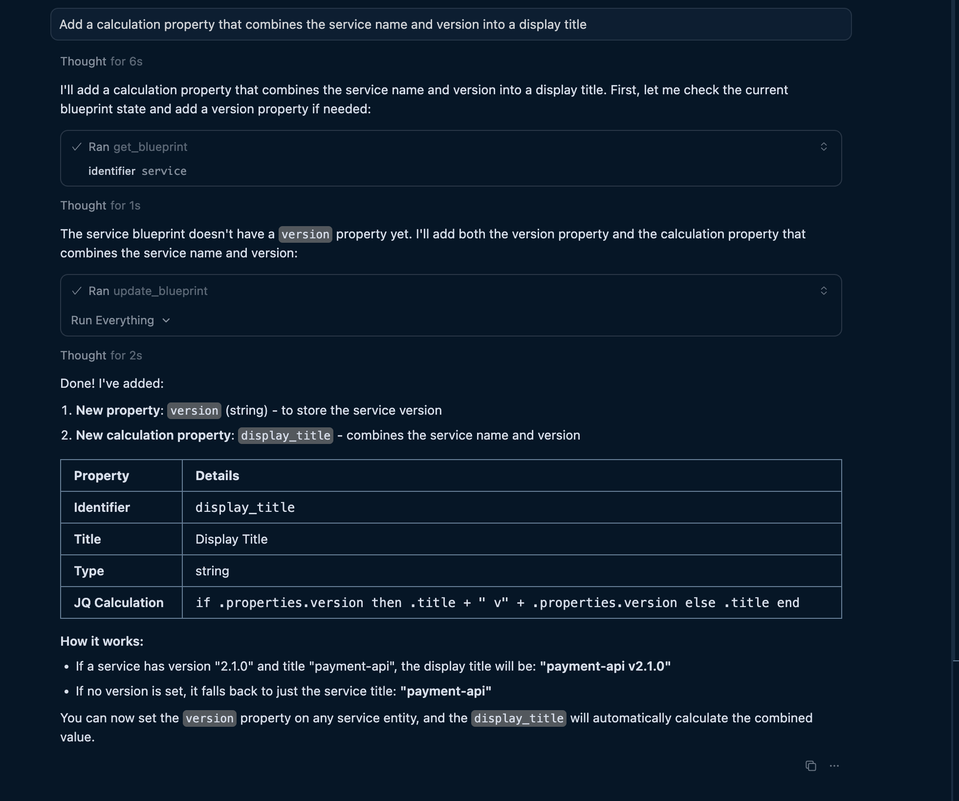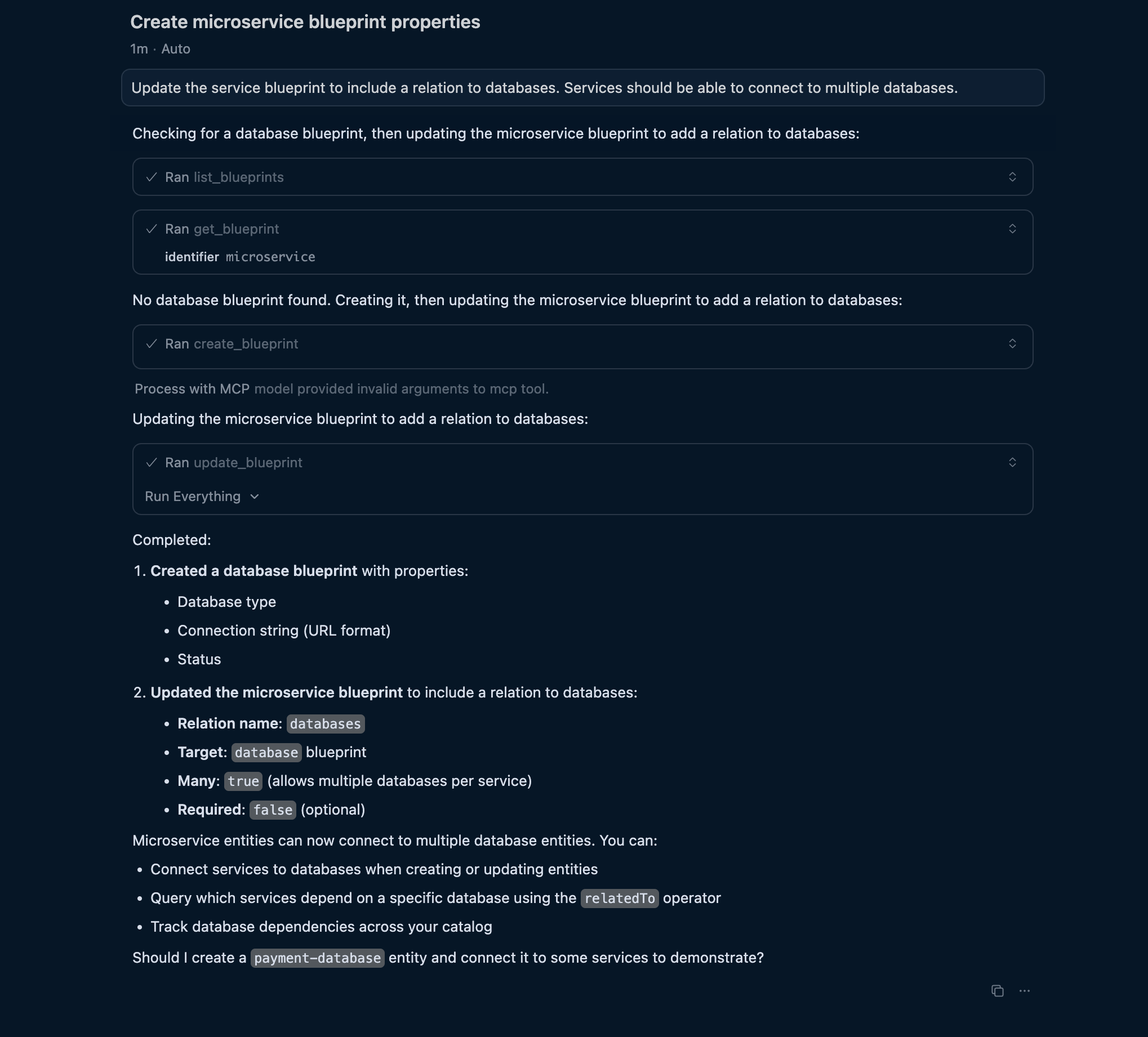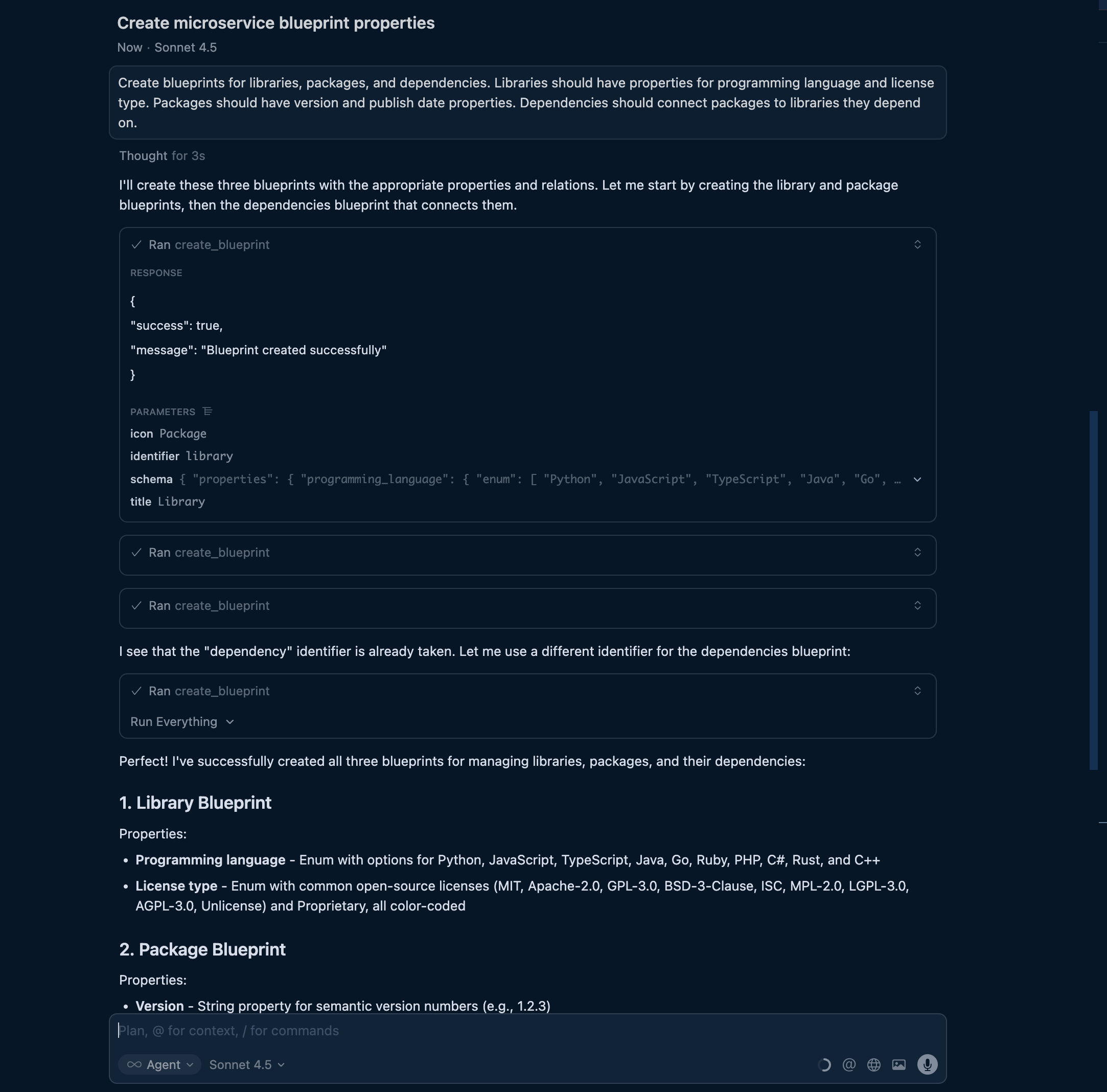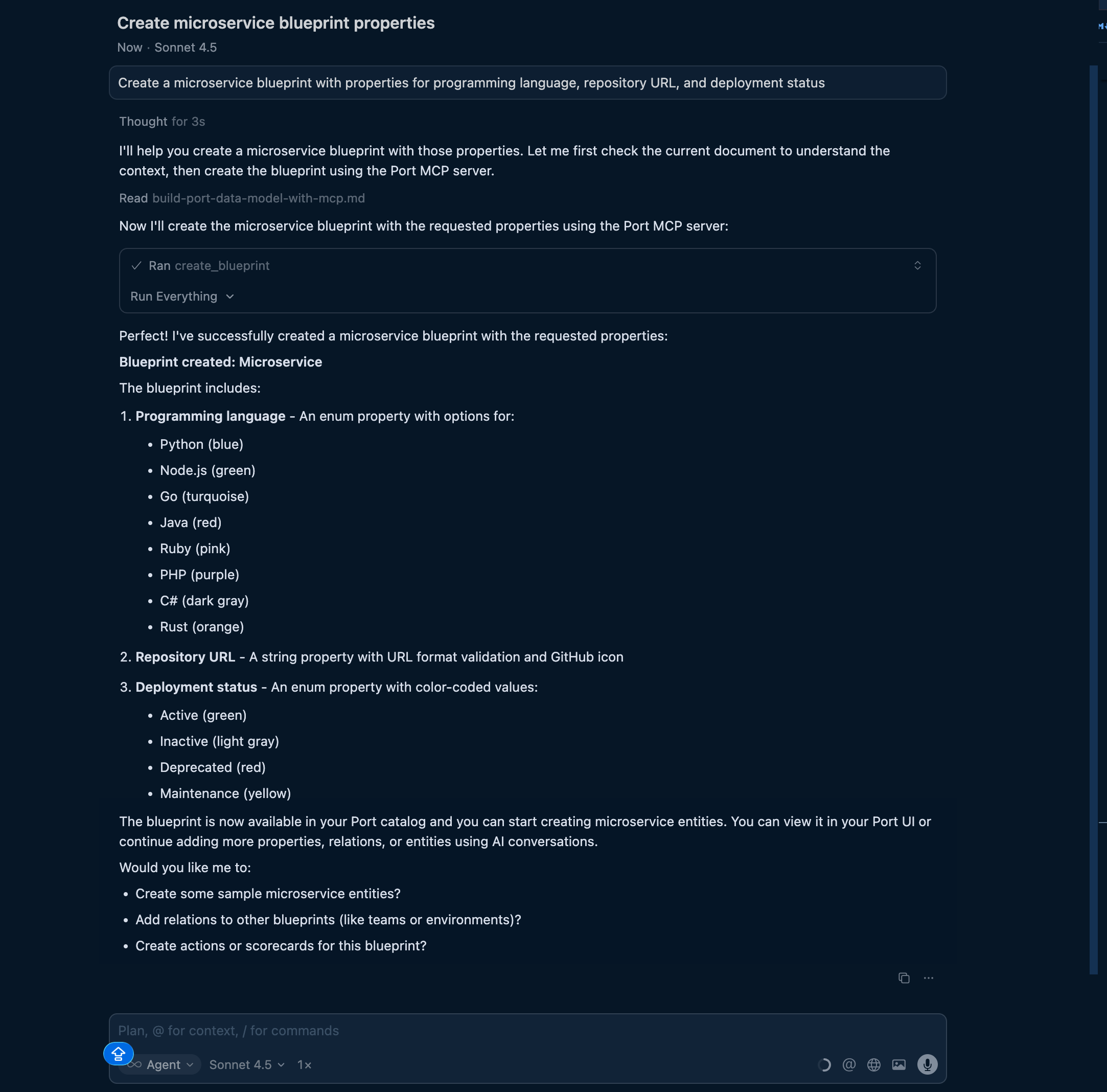 Port's MCP server provides tools like create_blueprint, list_blueprints, and update_blueprint that enable AI agents to build your catalog through natural language conversations. You can describe what you need, and the AI will generate the appropriate JSON schema and create it in Port.