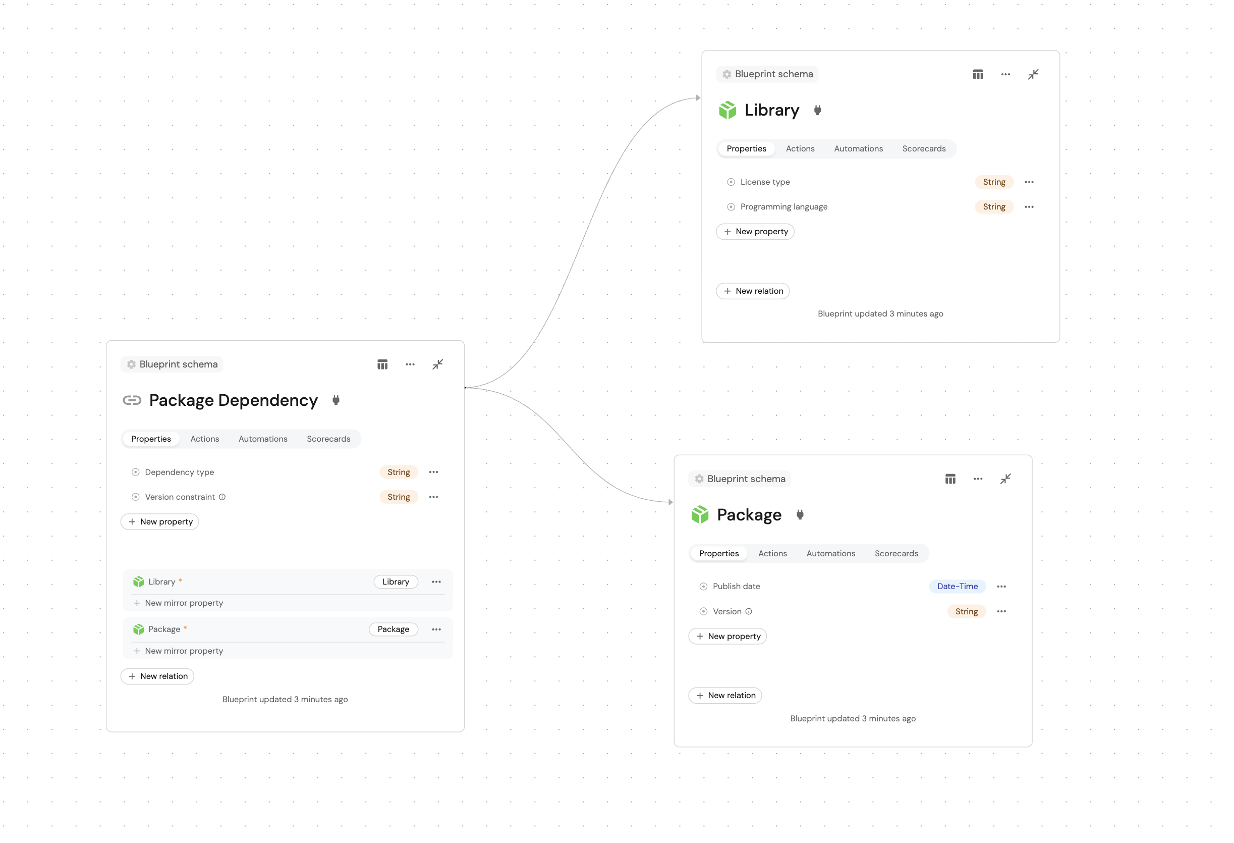 "Create blueprints for libraries, packages, and dependencies. Libraries should have properties for programming language and license type. Packages should have version and publish date properties. Dependencies should connect packages to libraries they depend on."
