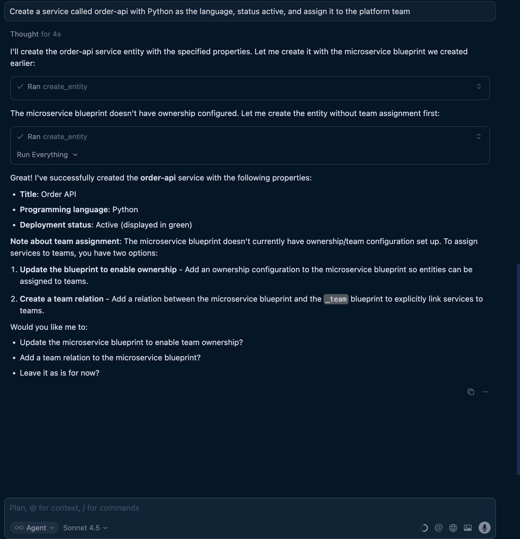 Instead of manually configuring JSON schemas or clicking through UI forms, you can have conversations with your AI assistant to build your catalog iteratively, getting instant feedback and making adjustments on the fly.