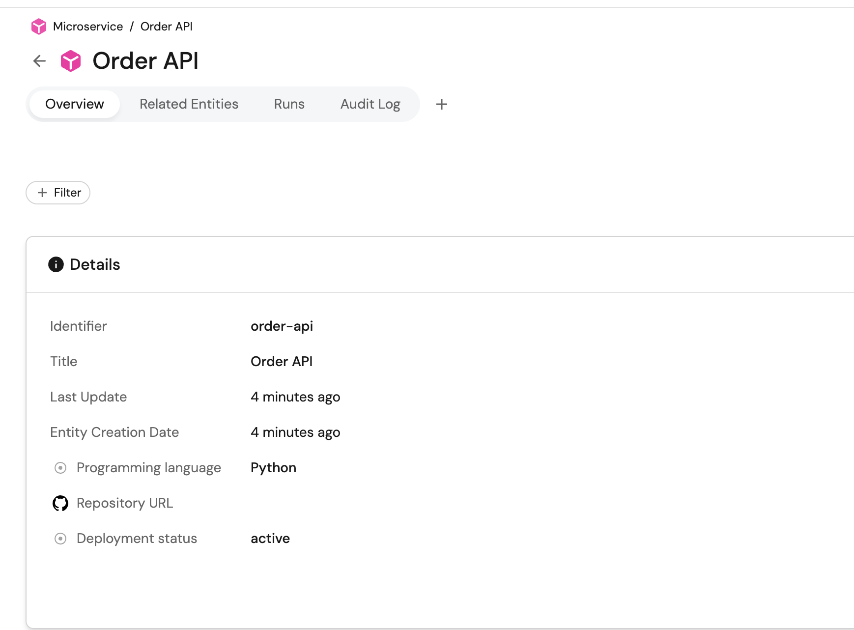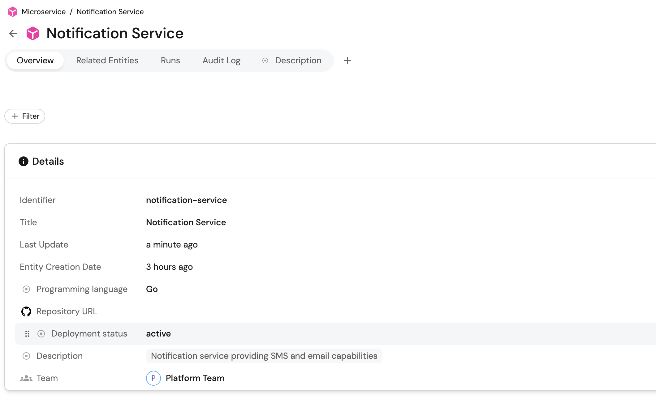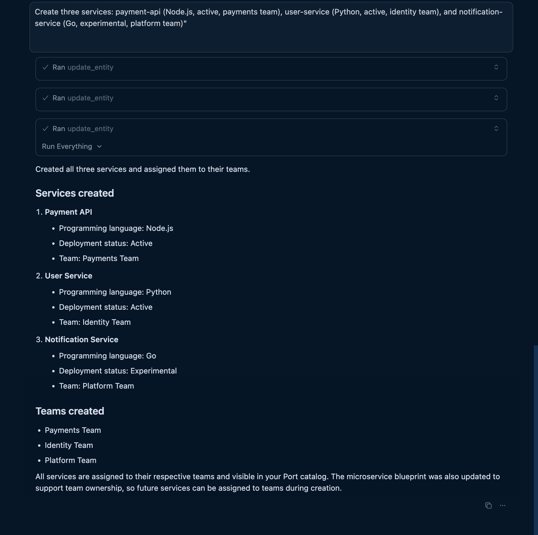 • Populate entities: Ask AI to create services, teams, or environments based on your requirements.