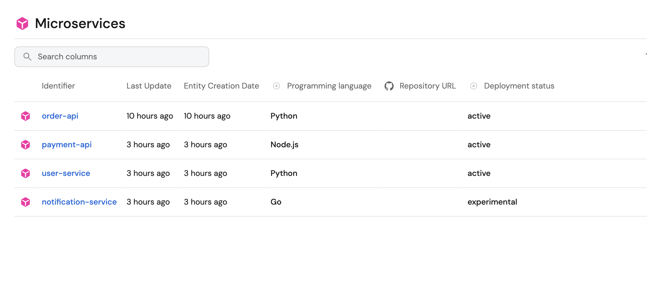 "Create three services: payment-api (Node.js, active, payments team), user-service (Python, active, identity team), and notification-service (Go, experimental, platform team)"