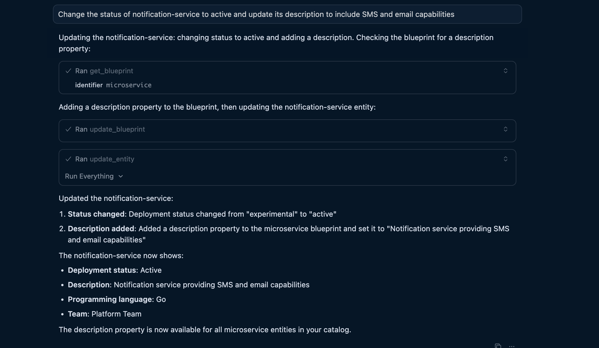 • Bootstrap new catalogs: Describe your architecture and let AI create the initial blueprint structure.