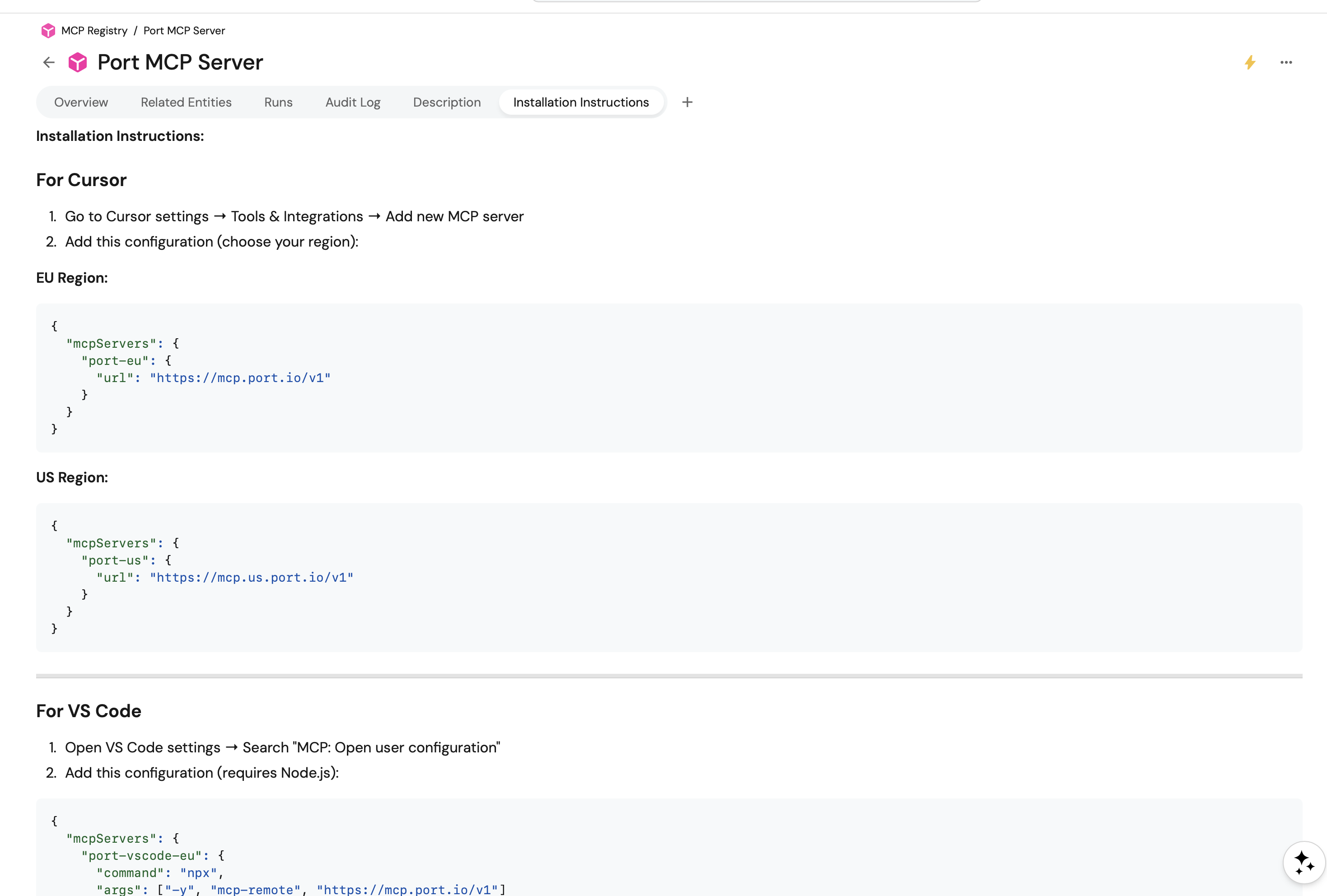 uvx mcp-server-port@latest --client-id <YOUR_PORT_CLIENT_ID> --client-secret <YOUR_PORT_CLIENT_SECRET> --region EU