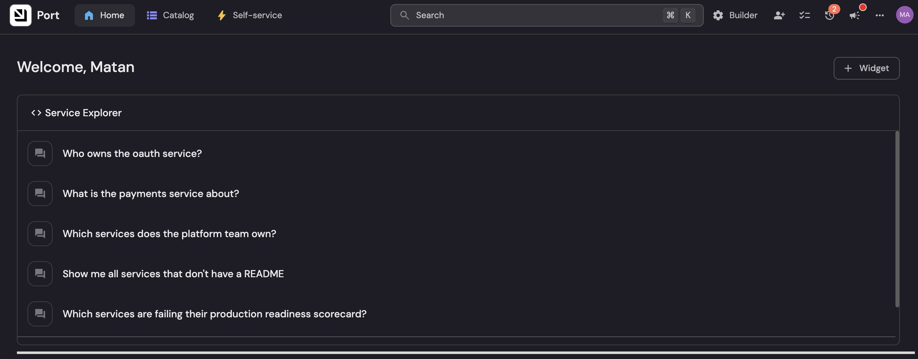 The Service Explorer AI agent can be accessed through an AI Agent widget in your Port dashboard. Follow the steps below to set it up: