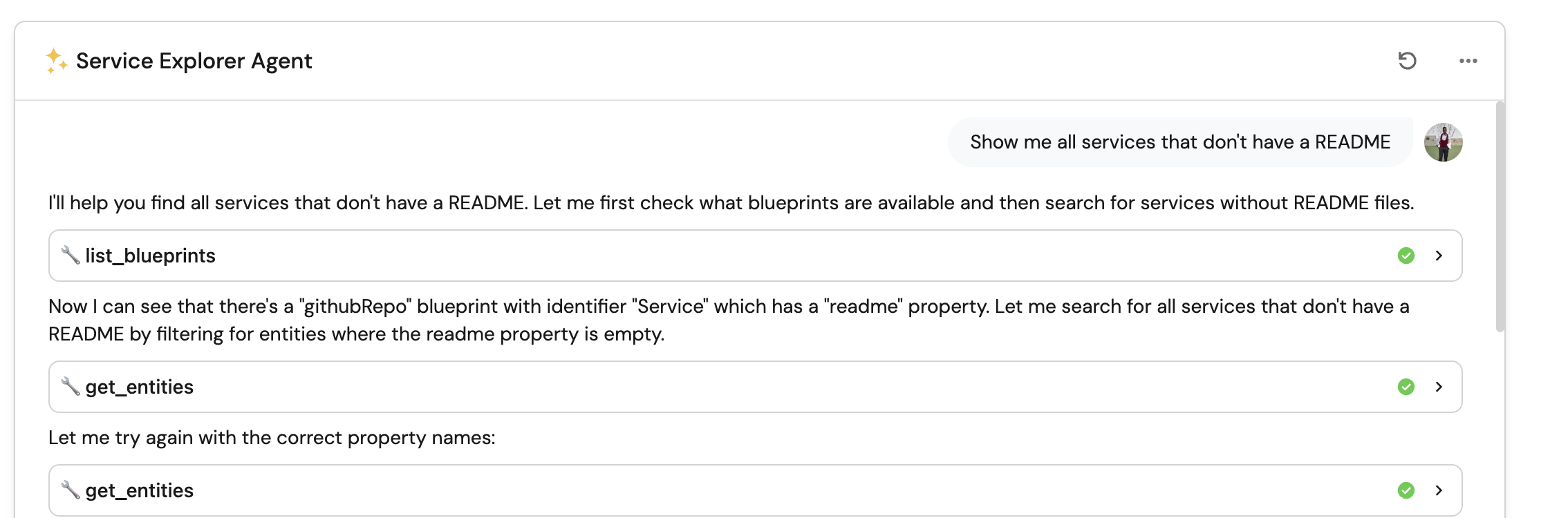 The AI agent uses MCP (Model Context Protocol) enhanced capabilities to automatically discover important and relevant blueprint entities via its tools. The ^(list|get|search|track|describe)_.* pattern allows the agent to access and analyze related entities across your entire software catalog, including services, repositories, teams, users, incidents, deployments, monitoring data, and more. This automatic discovery means you don't need to manually configure which blueprints the agent can access - it intelligently finds and uses relevant data to answer questions about your services.