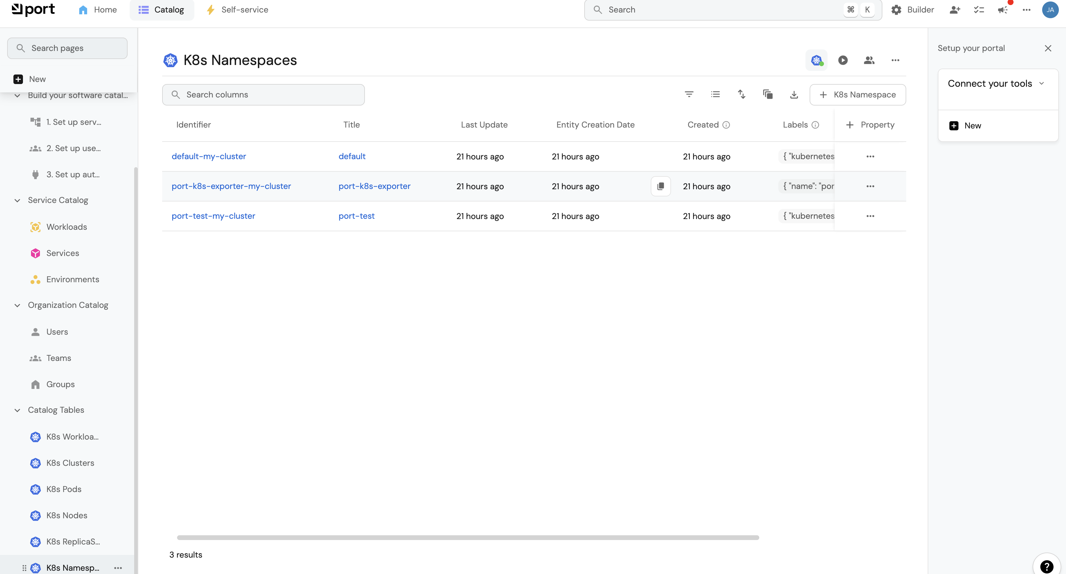 To visualize your cluster's workloads in Port, we will first install Port’s Kubernetes exporter, which automatically creates Kubernetes-related blueprints and entities in your portal.