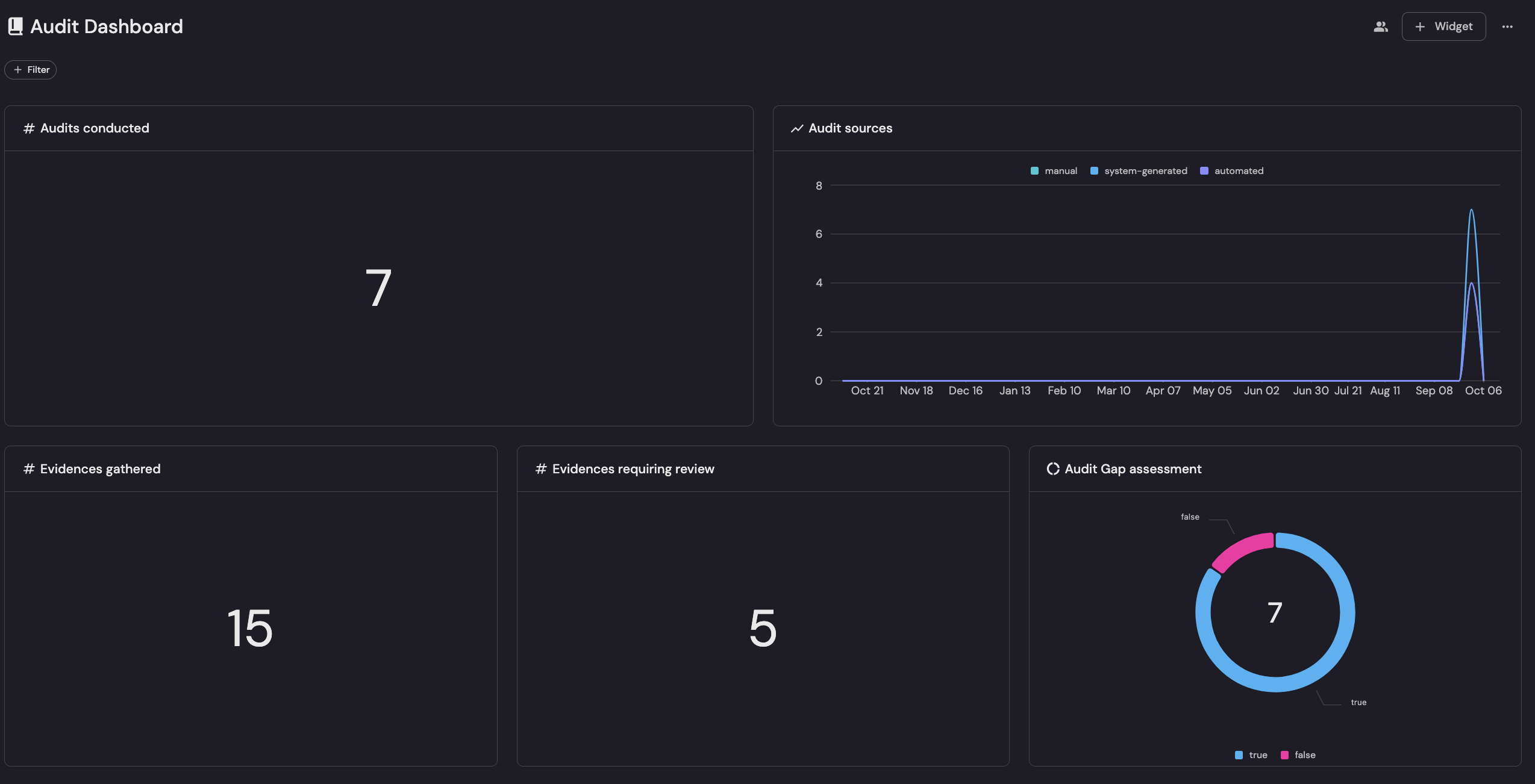 • Assurance shows 7 audits completed, 15 evidences collected, and 5 pending review.