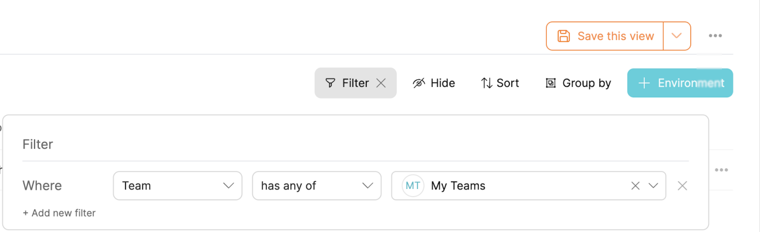 By using the My Teams filter you will only see entities that belong to one of your teams. This means you will only see entities from teams that you are a member of.